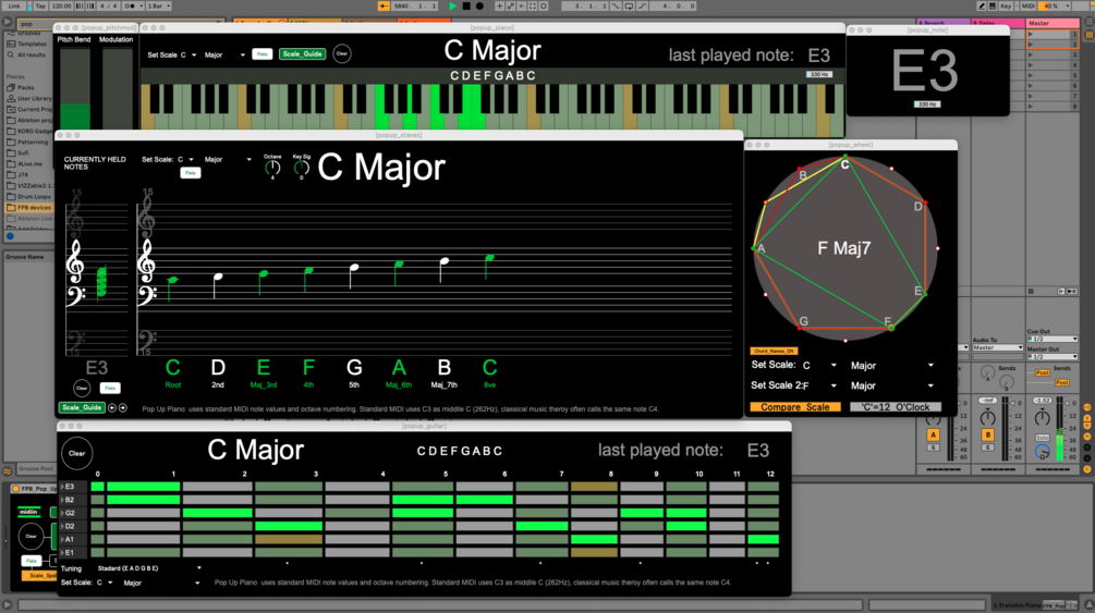 Pop Up Piano is a Max for Live device that comprises a number of floating windows visualising MIDI input with scale guides in a manner that is useful for teaching and learning about music. These include a piano keyboard, musical stave, pitch-bend and modulation display, simple note name display and now includes a tone wheel and guitar fretboard display.
