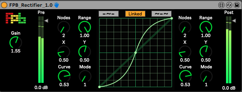 The Fingers Push Buttons, Max for Live device, Rectifier takes incoming signal in frames and passes them through a conversion table in real time to create rectified signals. The most common use of this kind of tool is to create overdriven/distorted versions of the input signal but it has wider applications too.